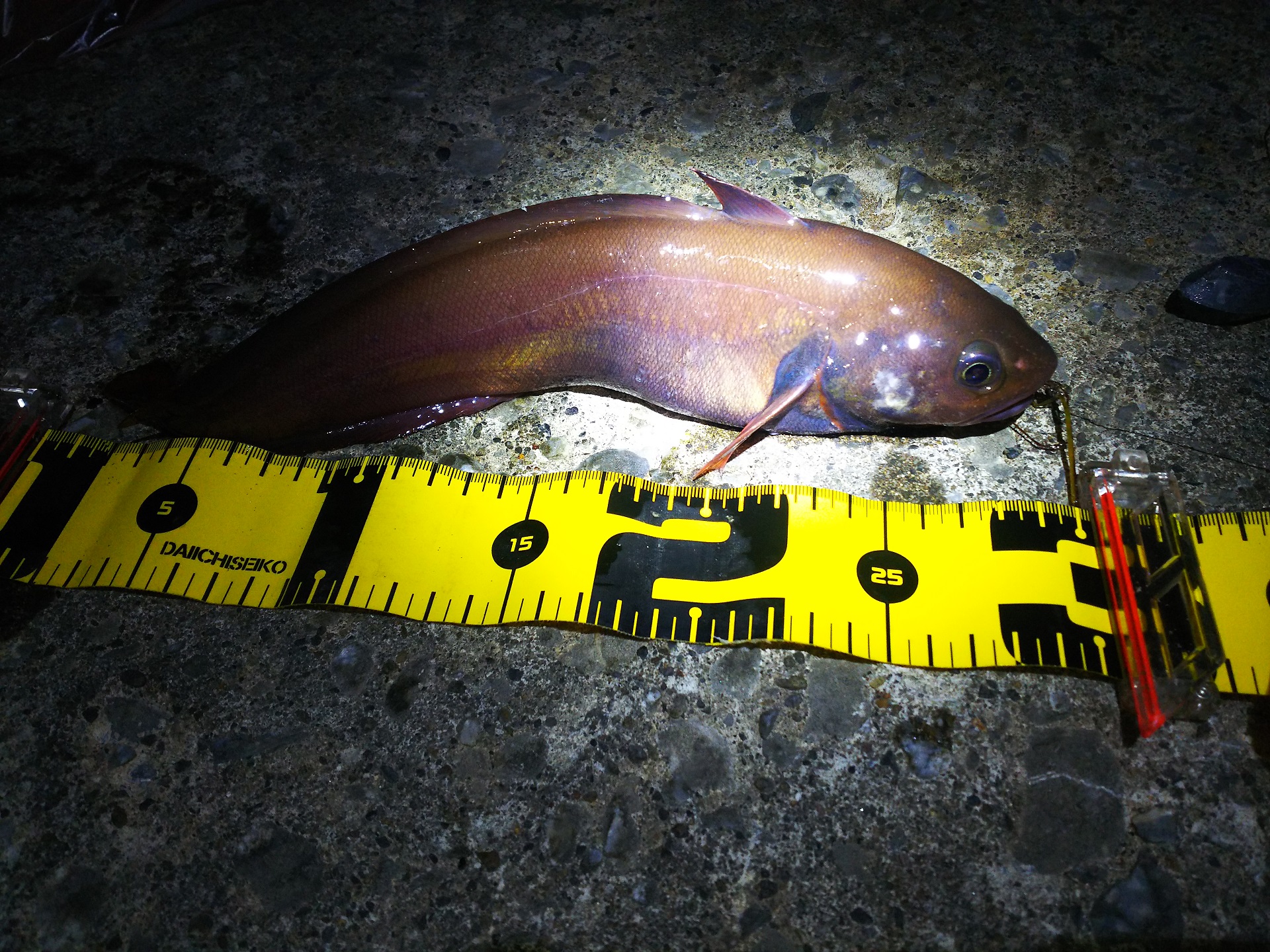投げ竿だったんですが、竿を持ってかれそうになるようなアタリ、巻いてみると重いような軽いようなよく分からん引き、足元まで寄せると急に重みが増してくる。