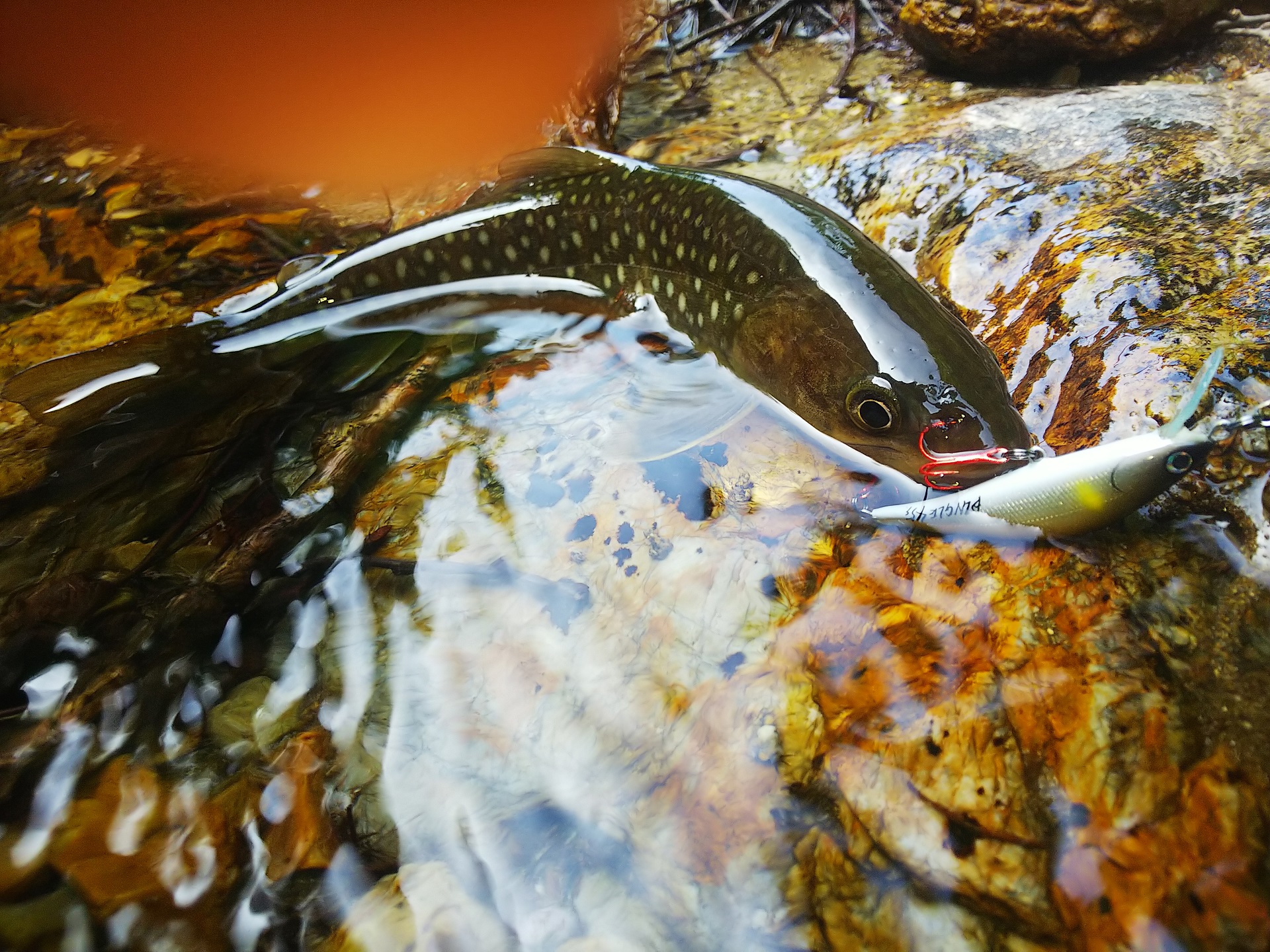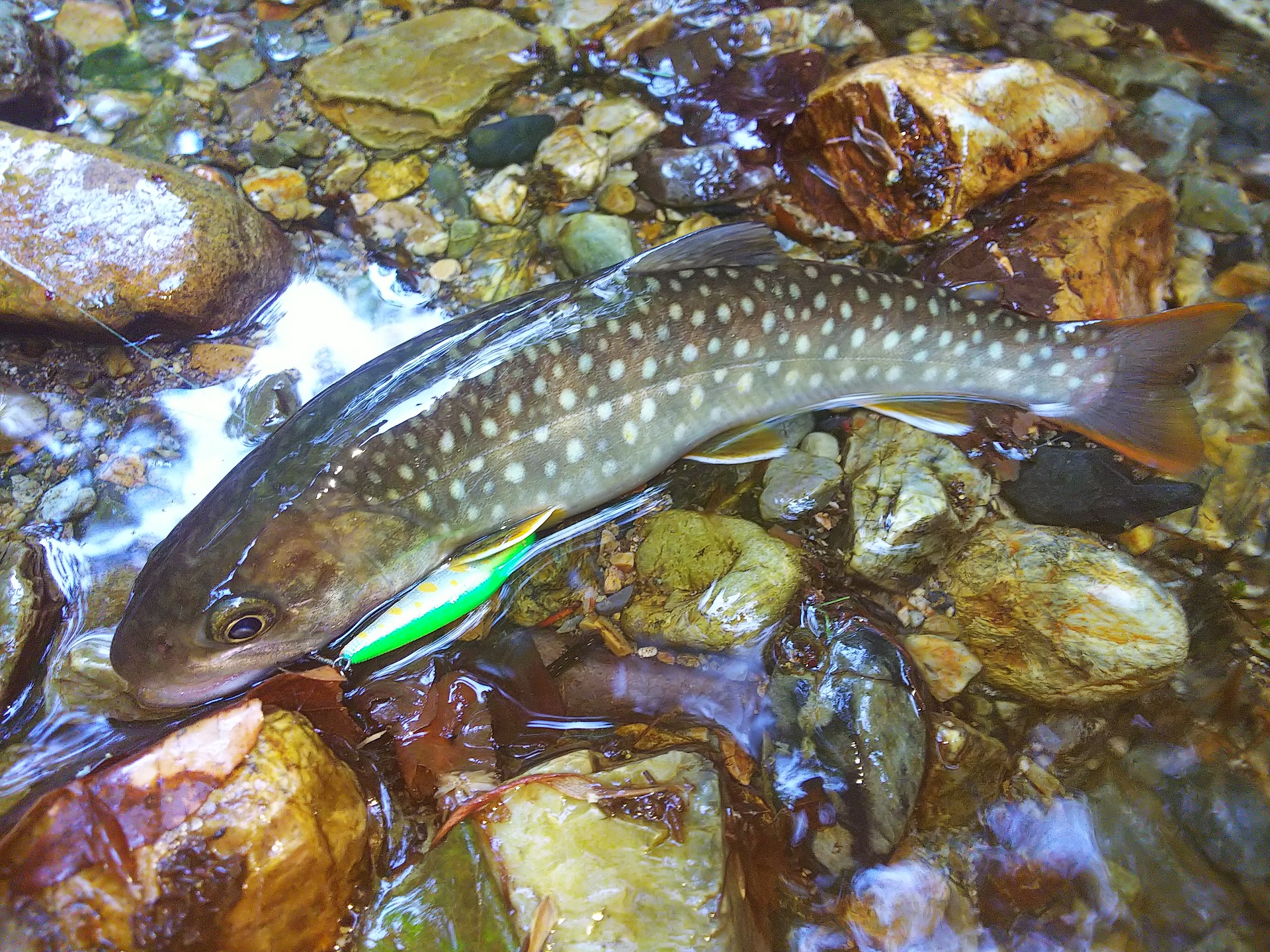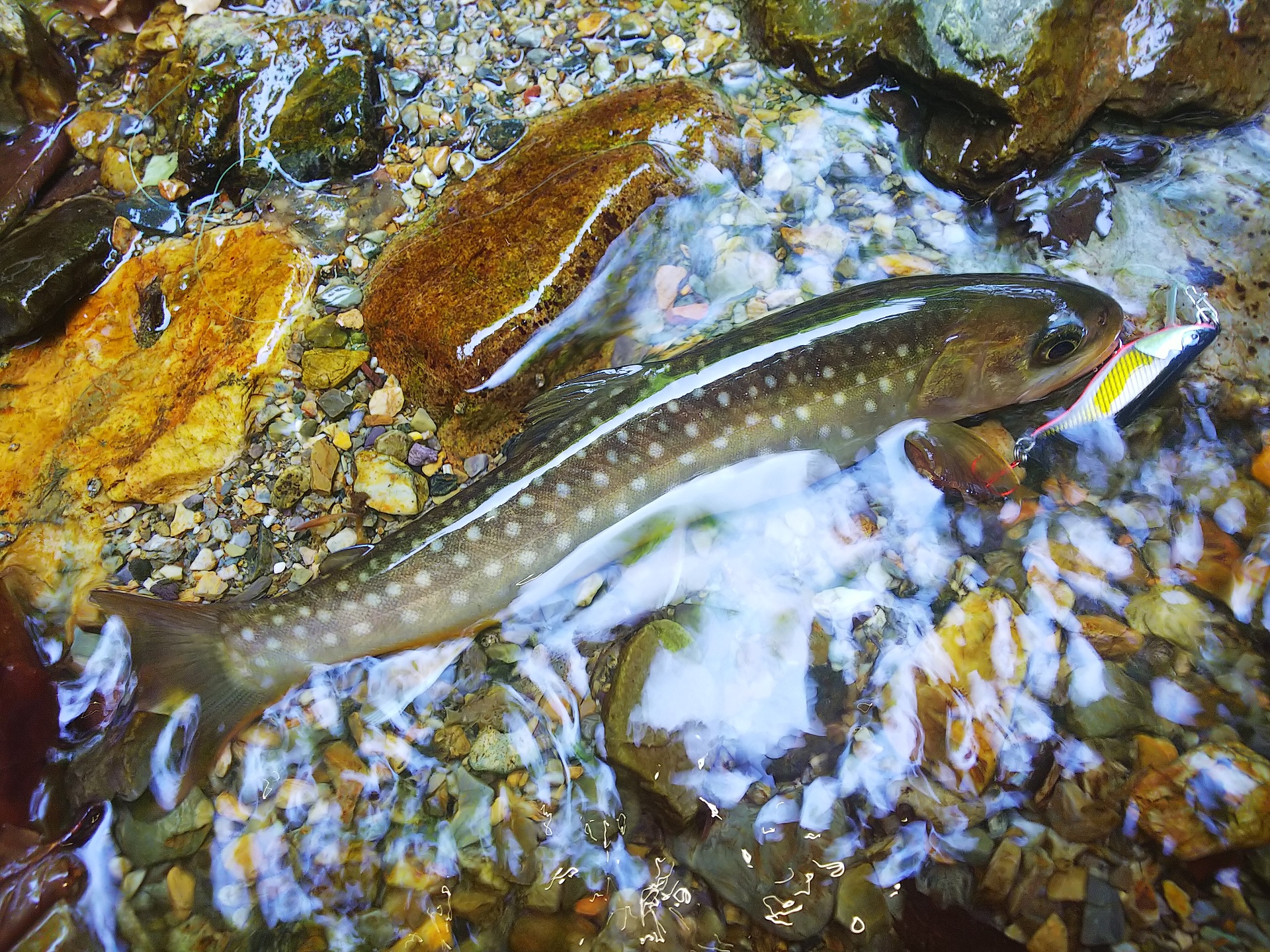魚の反応が良くてこれはチャンスと思い、2月に宮古のトラウトイベントで買ったハンドメイドルアーも試してみた。