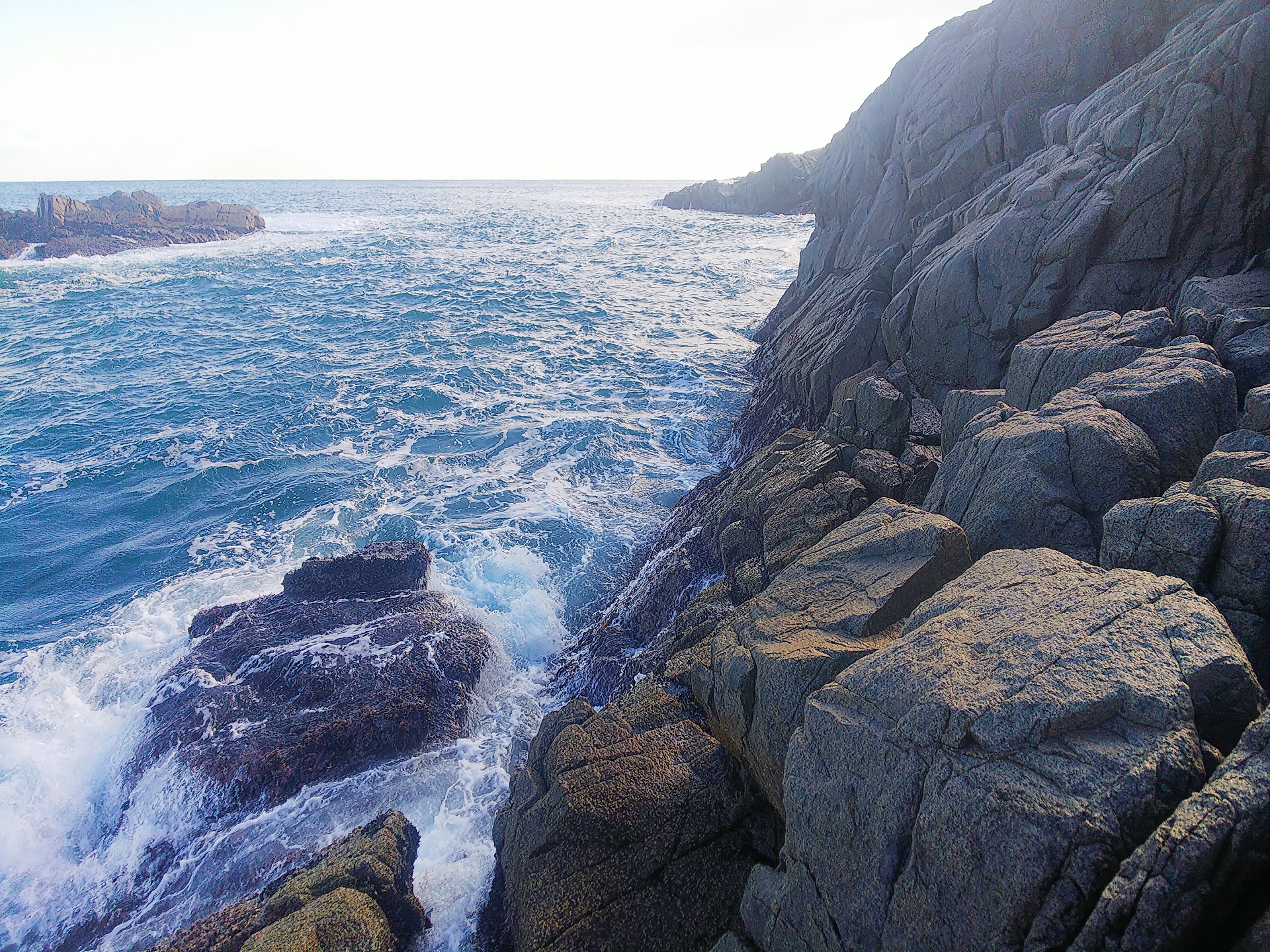 写真中央の沖の岩と岩の間の奥に投げるとカウント9くらいの深場になっている。
